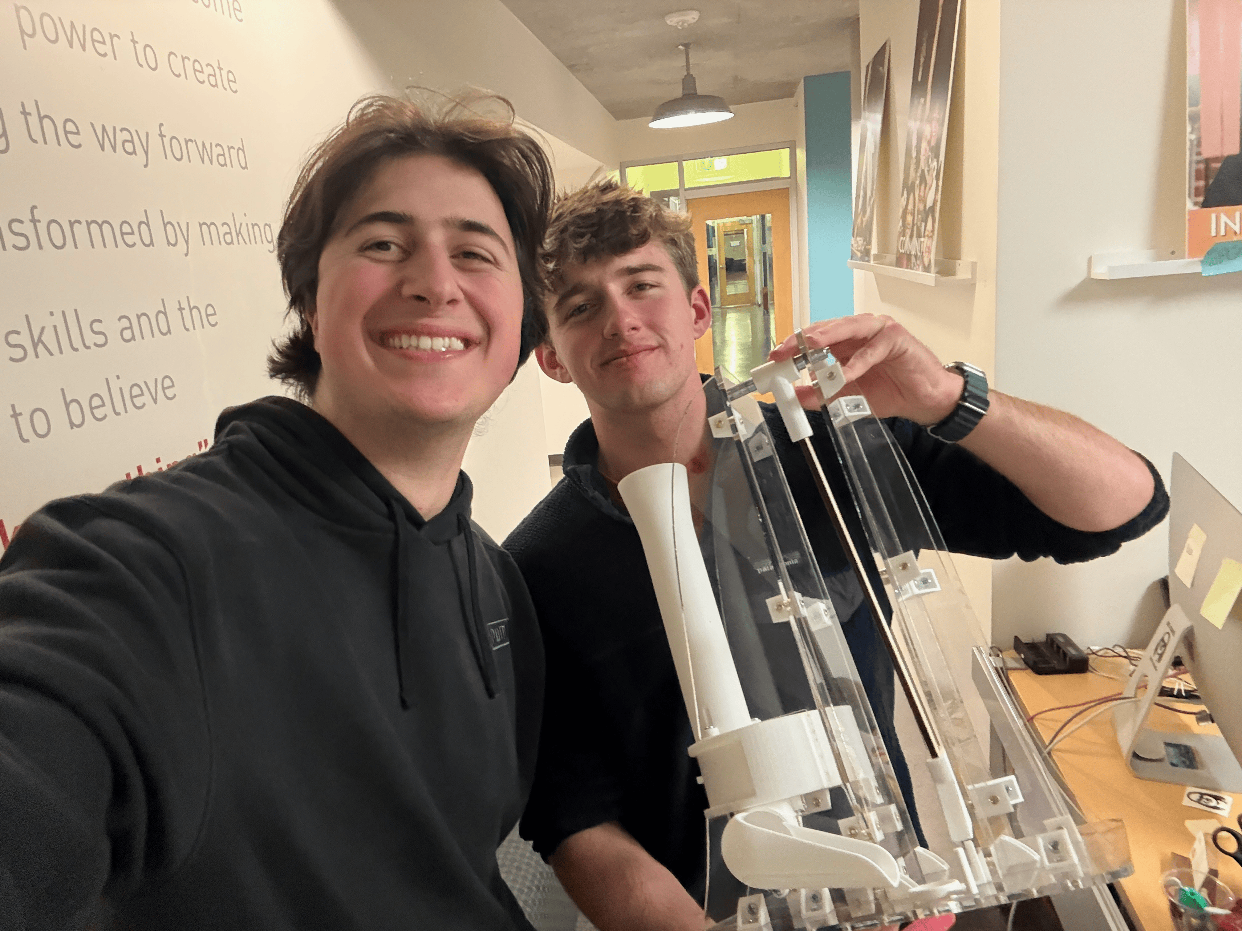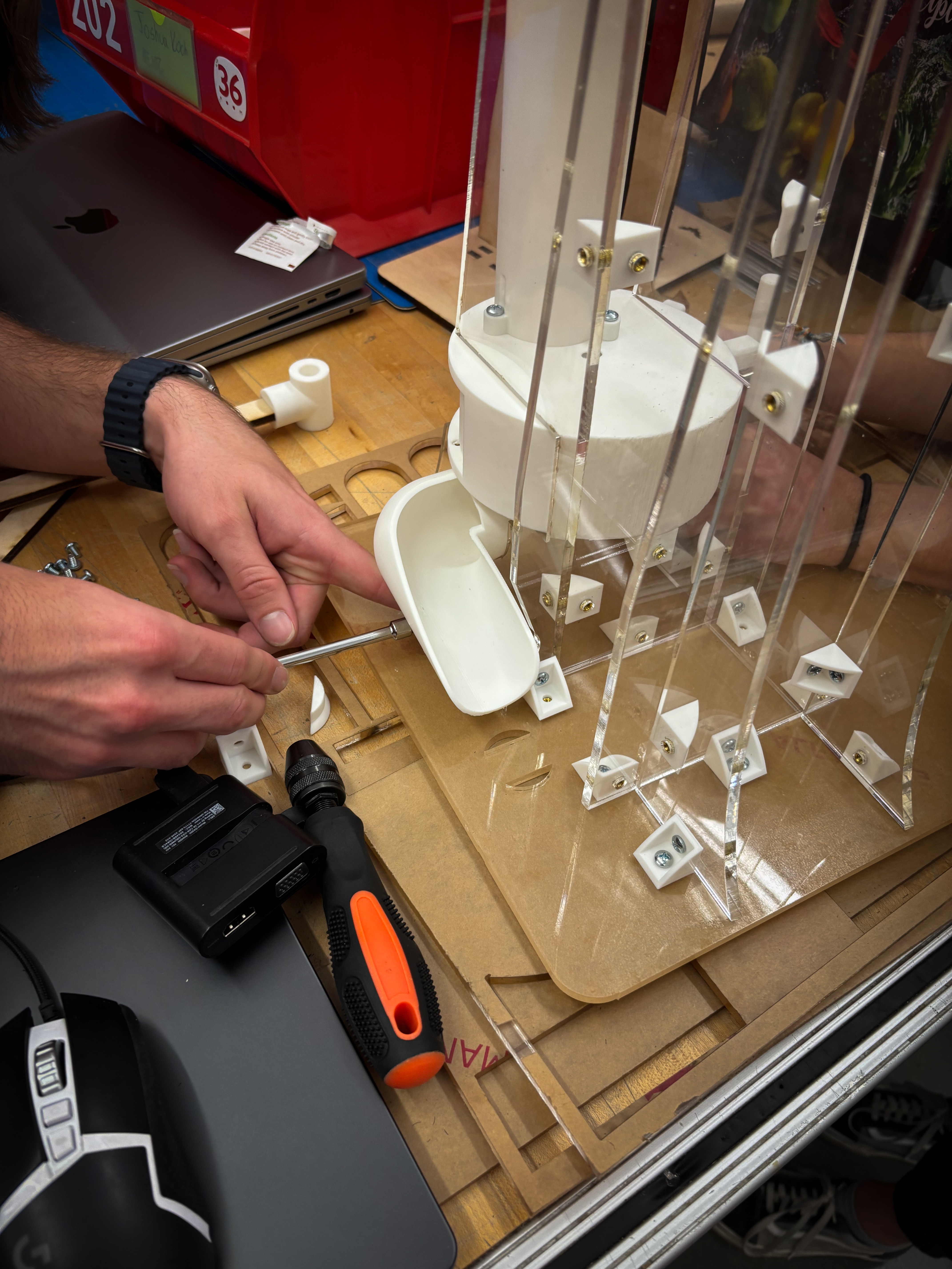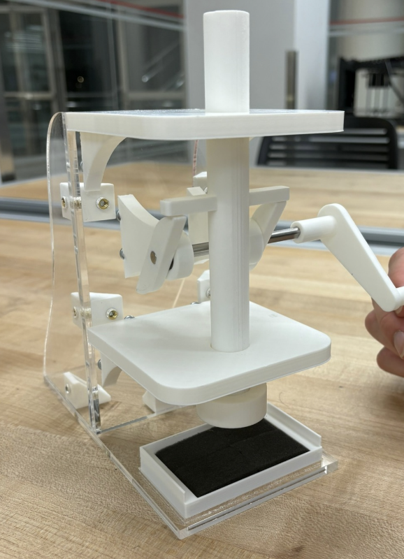 In a stroke of genius, one of our group members had the idea to replicate a golf swing in a pendulum-type launcher that would use gravity to power the launcher. We incorporated the spring into the reload mechanism, which our instructor approved of. Big shout out to Joshua for the idea, and for him spending several hours in the PRL coming up with a prototype to prove to the rest of our group that it would make a superior launcher. Without springs, our launcher was more consistent, and we wouldn’t have to worry about springs breaking or wearing during the final trial. Plus, the one spring we did use made for a very satisfying reload mechanism. We called it Happy Gilmore.