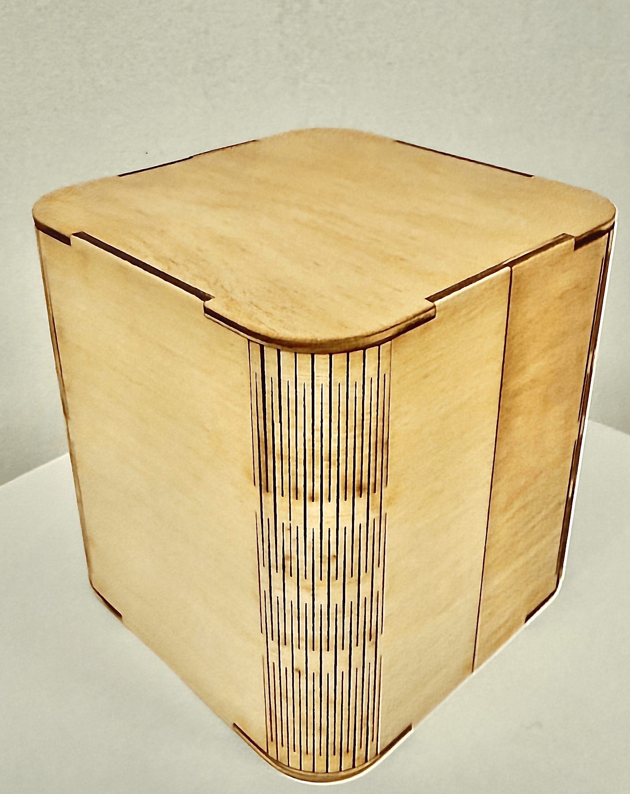 Pretty self explanatory. The assignment was to create a non-rectangular laser cut box, without using adhesives or fasteners. I knew I wanted to incorporate kerf cuts into my design, and settled on this. I initially wanted to create a cylindrical shaped box, but decided that would make the friction fits too difficult, so settled on this design.